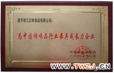 在2010年11月浙江正味食品有限公司被中国调味品协会授予中国调味品最具成长力企业