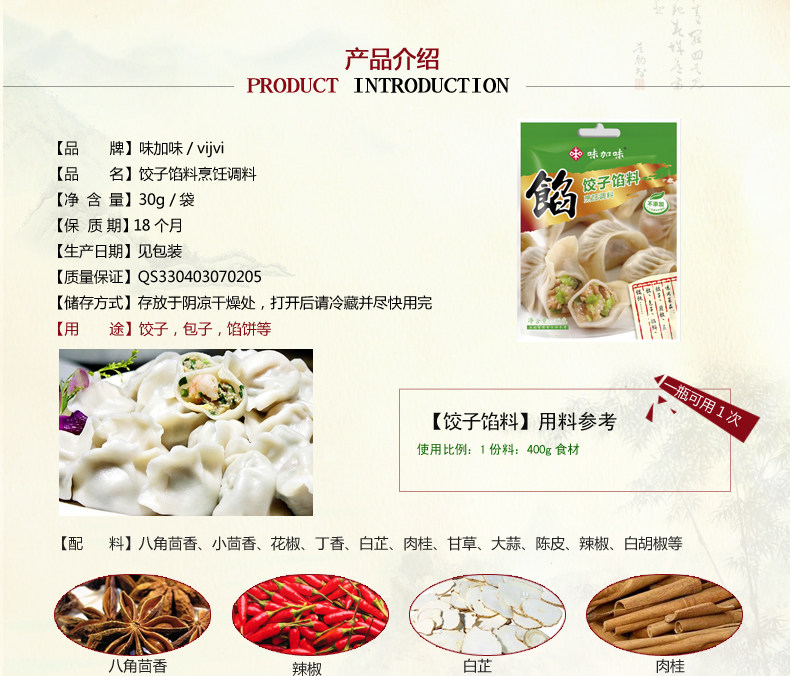 配料表:八角茴香、花椒、小茴香、丁香、白芷、肉桂、肉豆蔻、草果、砂仁、山奈、生姜、陈皮、白胡椒、大蒜、甘草、洋葱、辣椒
