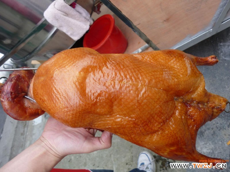 D:鸭坯入炉前半小时浇二遍糖水(饴糖、水、大红浙醋的比例为1:20:0.3),然后将净毛巾用糖水浸湿,拧至半干,将鸭坯逐一擦拭(为保证糖水的均匀度),再用鸭堵堵住鸭肛门,最后从刀口处向腹腔内灌入开水至八成满,即可正式入炉烤制。一般烤50分钟出炉。