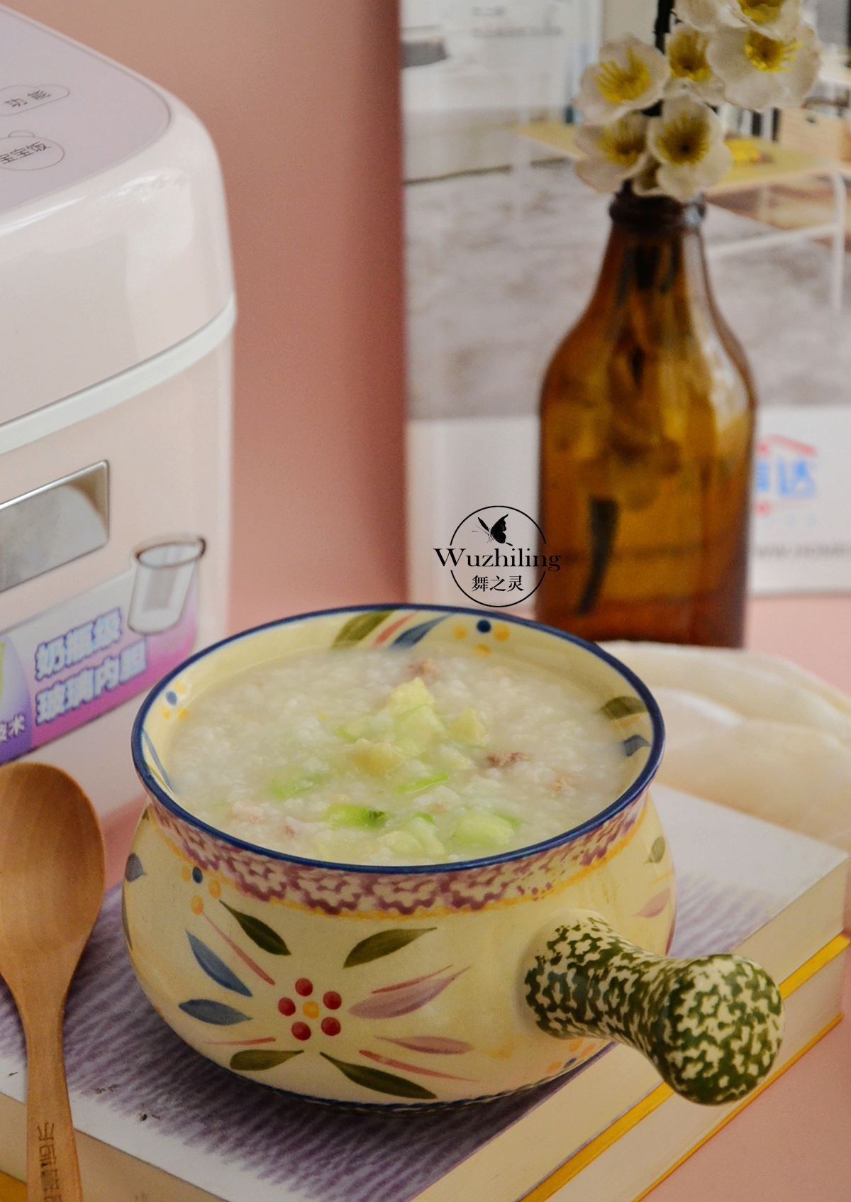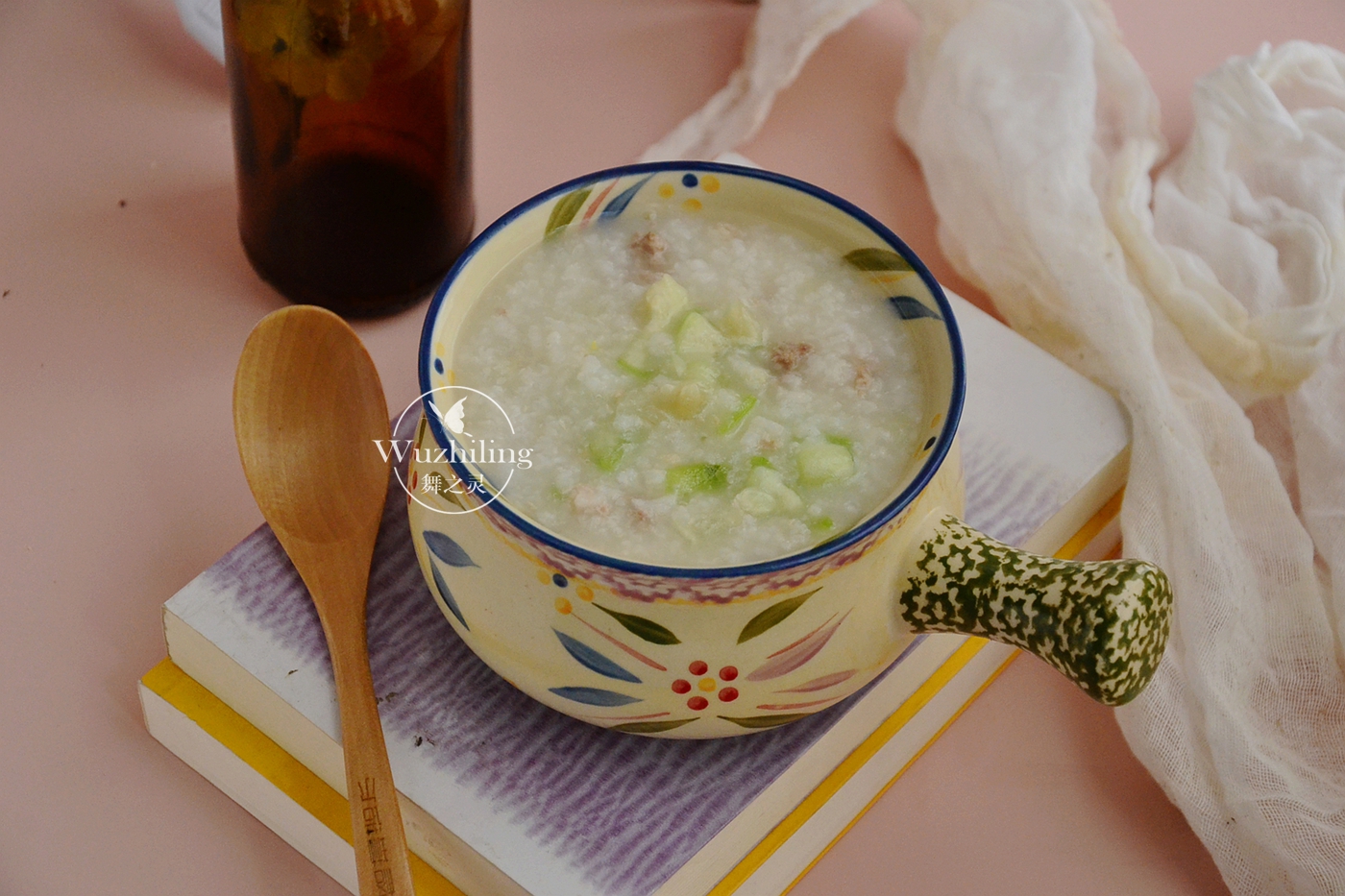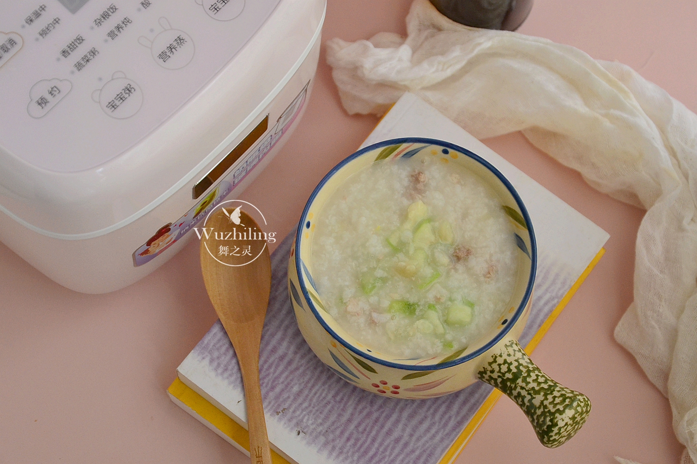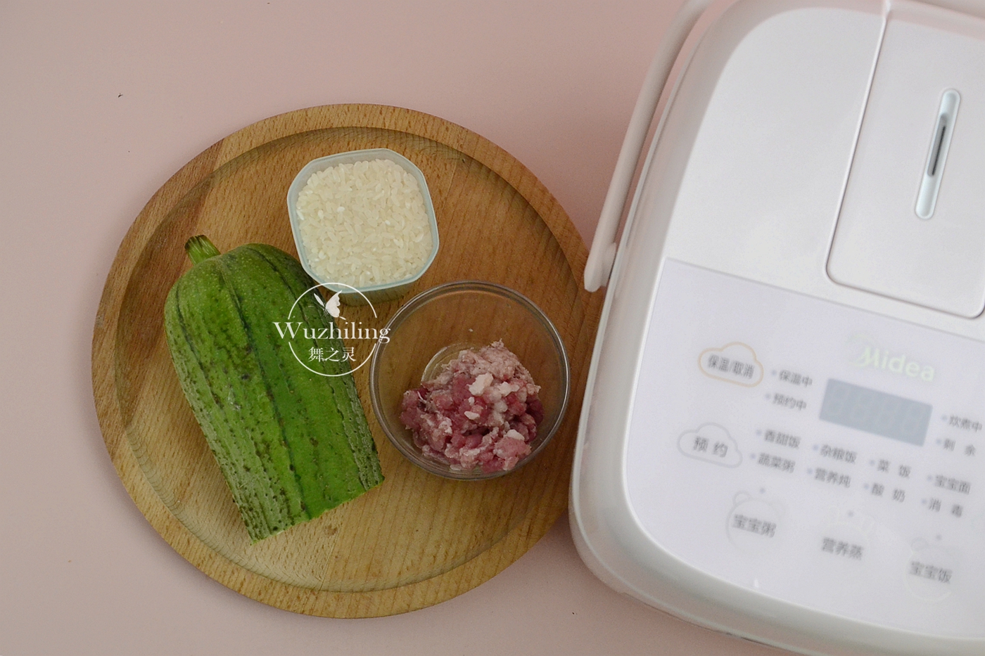 【肉末丝瓜粥】材料:大米一杯,丝瓜适量,肉末少许,调料:生抽、胡椒粉、盐。