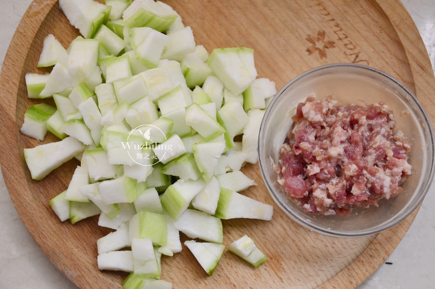 4、接着,将丝瓜去皮然后切成小丁,用量自己掌握,喜欢吃的就多放一些。然后后腿肉适量用刀剁碎了,加入生抽胡椒粉和少许的水,顺着一个方便不但的搅拌上劲,然后进行腌制。