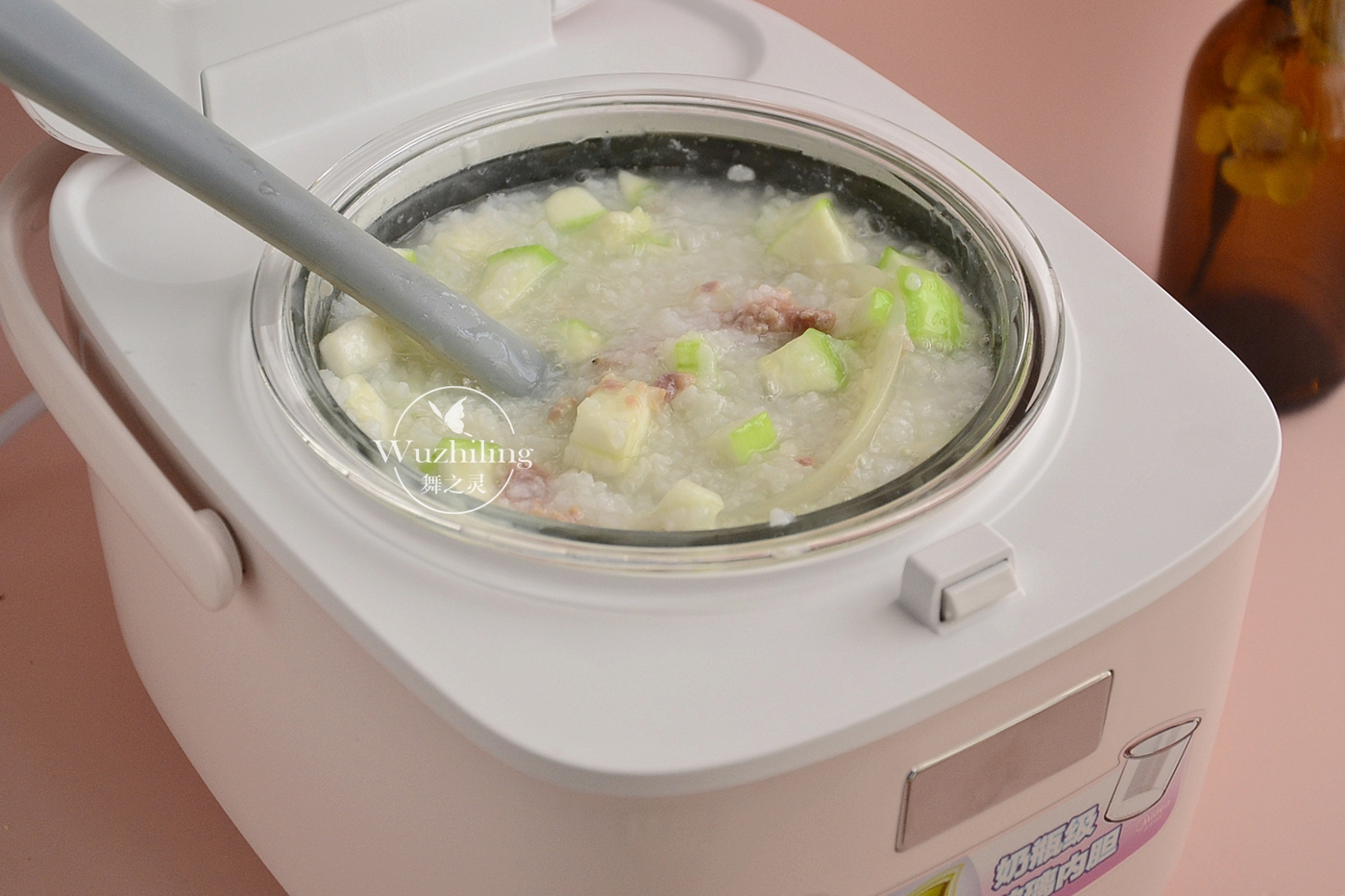 2、然后将玻璃内胆放入宝宝饭煲里面,直接盖上盖子开始熬煮。