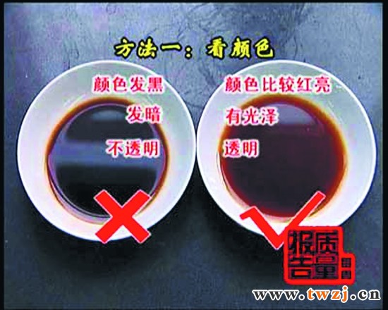 看颜色。正常的酱油色应为红褐色,品质好的颜色会稍深一些,但如果酱油颜色太深了,则表明其中添加了焦糖色,香气、滋味相比会差一些,这类酱油仅仅适合红烧用。