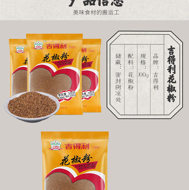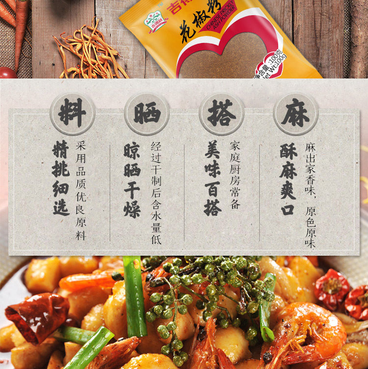 吉得利花椒粉100g调味粉调料香辛料佐料烧烤撒料干辣椒桂皮胡椒粒